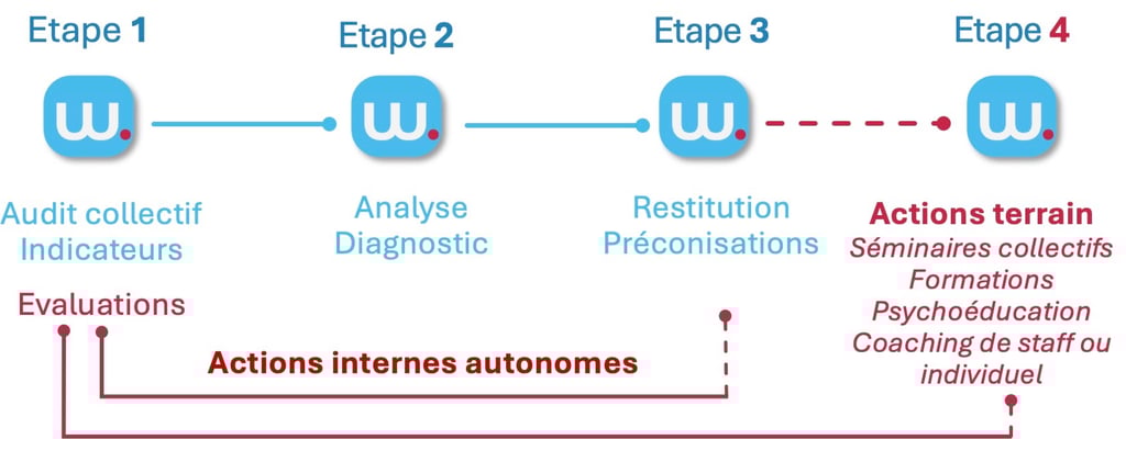 Nous acculturons d’abord les équipes ainsi que les dirigeants aux enjeux du développement des compétences émotionnelles, de l’intelligence situationnelle, des habiletés sociales... Puis, nous proposons et/ou animons des ateliers collectifs dont le but est toujours d’améliorer la performance collective.